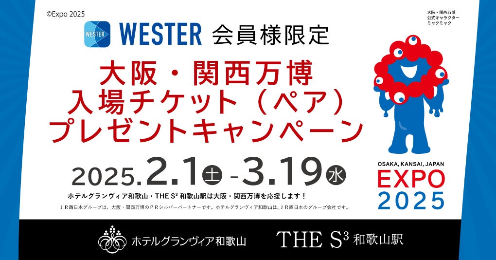和歌山ターミナルビル株式会社(和歌山県和歌山市、代表取締役社長 武田雅夫)が運営するホテルグランヴィア和歌山及びTHE S3(エスリー)和歌山駅は2025年2月1日(土)~3月19日(水)までの期間にWESTER会員様限定「大阪・関西万博入場チケット(ペア)プレゼントキャンペーン」を実施いたします。また、抽選でホテルグランヴィア和歌山の直営レストラン3店舗でご利用いただける1,000円分のデジタルクーポンが当たるチャンスもあります。