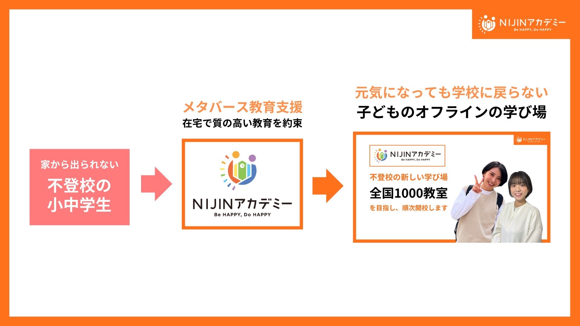 さらにメタバース校舎で元気を取り戻した子ども達から「復学ではなく、このままNIJINアカデミーで学び続けたい」という声も寄せられています。現在は、自宅から学べる「オンライン通学」に加え、実際の教室に通いながら学ぶ「リアル教室」と組み合わせた『ハイブリッド通学』を全国で展開し、子どもたちの多様なニーズに応える仕組みを整えています。