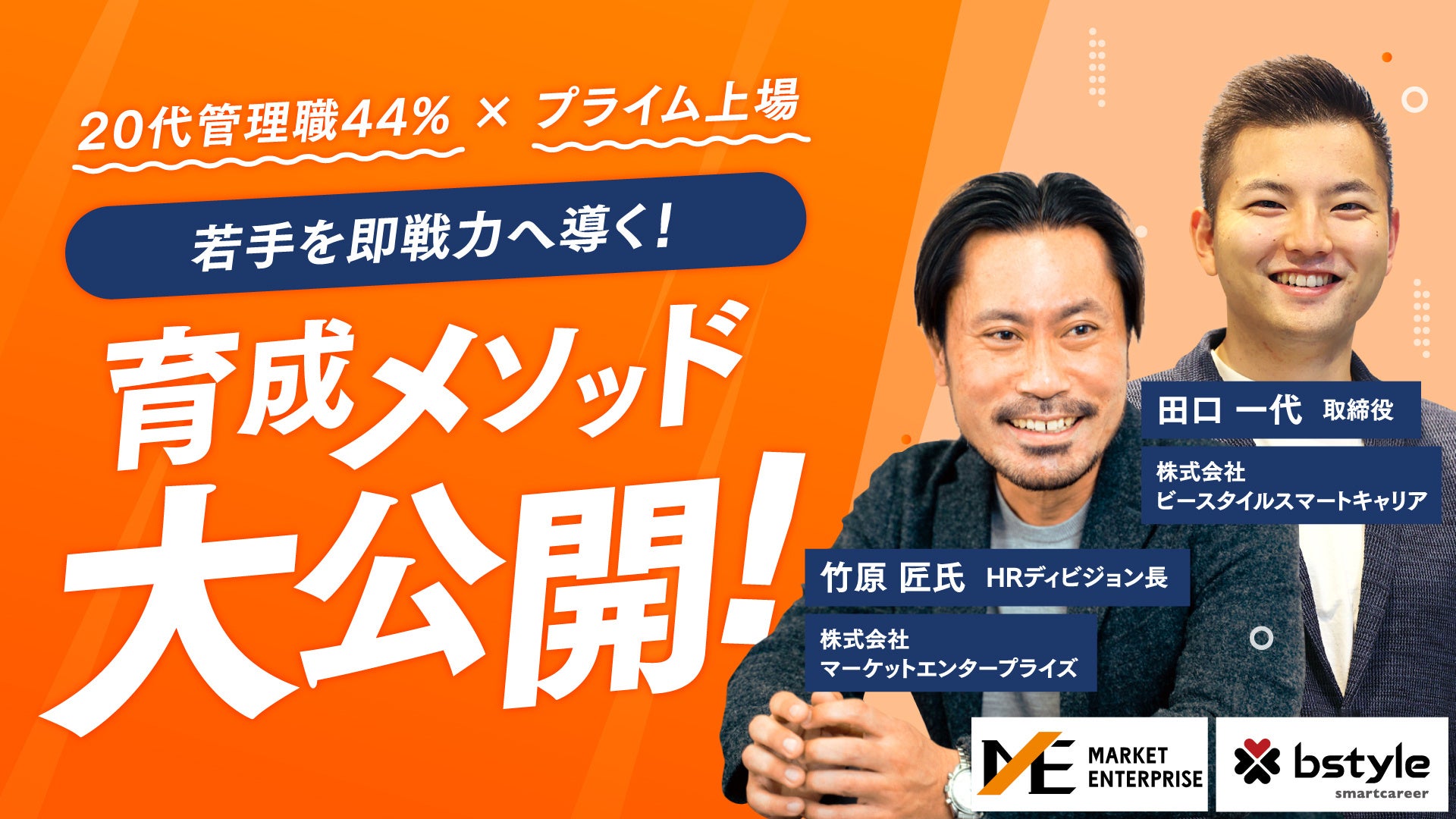 ビースタイルグループで時短など多様な働き方を可能にする人材派遣・紹介サービスを提供する株式会社ビースタイル スマートキャリア(本社:東京都新宿区、代表取締役社長:三原邦彦)は、株式会社マーケットエンタープライズ(東京都中央区、代表取締役社長:小林 泰士、東証プライム・証券コード3135)と共同で、「【20代管理職44% × プライム上場】若手を即戦力へ導く!育成メソッド大公開」をテーマに、2022年11月22日(火)12:00~13:00にウェビナーを開催いたします。
