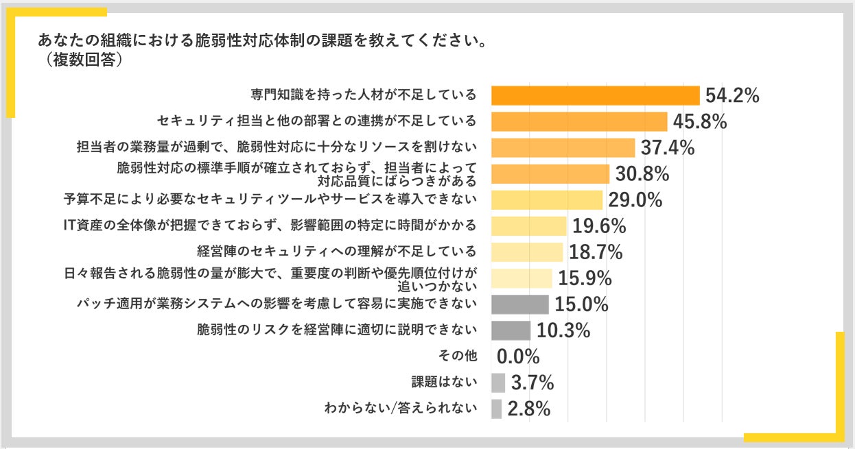 ・ 脆弱性対応体制の課題として、「専門知識を持った人材の不足」が54.2%で最多。