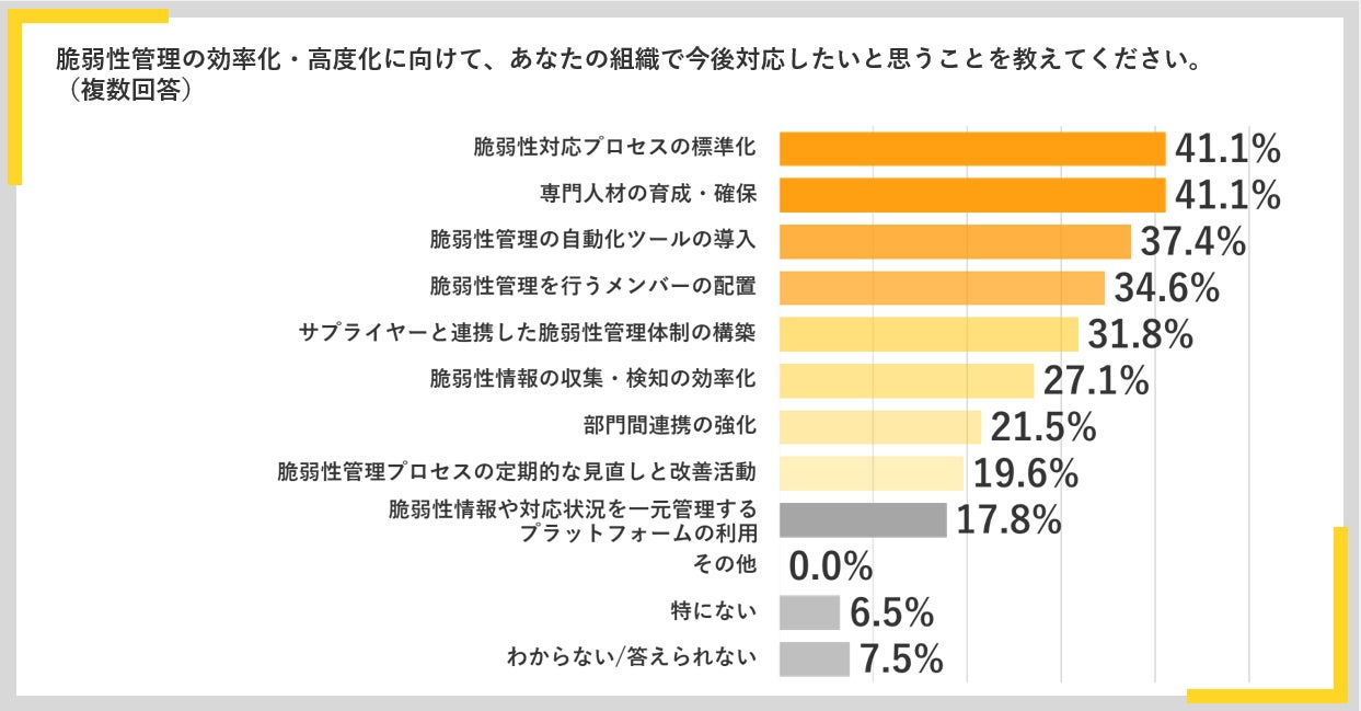 脆弱性管理の効率化・高度化に向けて今後対応したいことでは「脆弱性対応プロセスの標準化」と「専門人材の育成・確保」が41.1%と同率で最多となりました。いずれも多くを手動での作業に依存した脆弱性対応のありかたや、専門知識を持つ人材の不足といった課題を解決するために、非常に重要な取組みです。対応プロセスを標準化することで、自動化ツールの導入も容易になり、担当者の経験やスキルにかかわらず誰でも一定の品質で対応できるようになります。