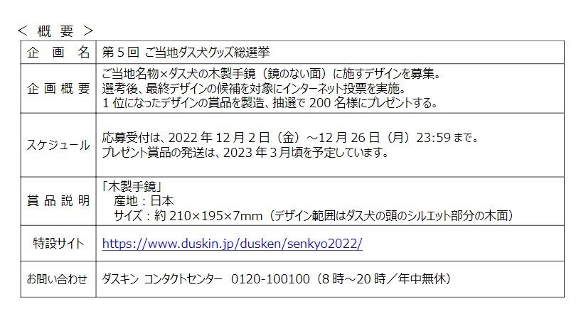 当社は「お客様の暮らす街や地域でもっとお役に立ちたい」という思いのもと、地域社会に貢献できる企業として、地域の皆様に寄り添った様々な活動を展開しております。『ご当地ダス犬グッズ総選挙』は、全国各地のご当地名物を、ダス犬を通じてより多くの皆様に知ってもらうことで、各地域の活性化につながればとの思いで、各地の名産品や民芸品等と当社のキャラクター「ダス犬」を組み合わせたデザインを募集し、インターネットでの人気投票で1位に輝いたデザインを採用したオリジナルグッズを開発するという企画で、今年で5回目の開催となります。今回はダス犬の頭のシルエットをかたどった、国産ヒノキ間伐材から作られたナチュラルで環境にやさしい木製手鏡に描くデザインを募集。全国から407作品ものご応募があり、その中から最終候補のデザイン22作品を選出し、インターネットによる人気投票の結果、ペンネーム:たすく様がデザインされた「山口県/大内人形」が9,458票を獲得して1位に選ばれました。こちらのデザインを描いた木製手鏡を抽選で200名にプレゼントします。応募はご当地ダス犬グッズ総選挙の特設サイトにて12月26日(月)まで受け付けます。皆様のご応募をお待ちしております。