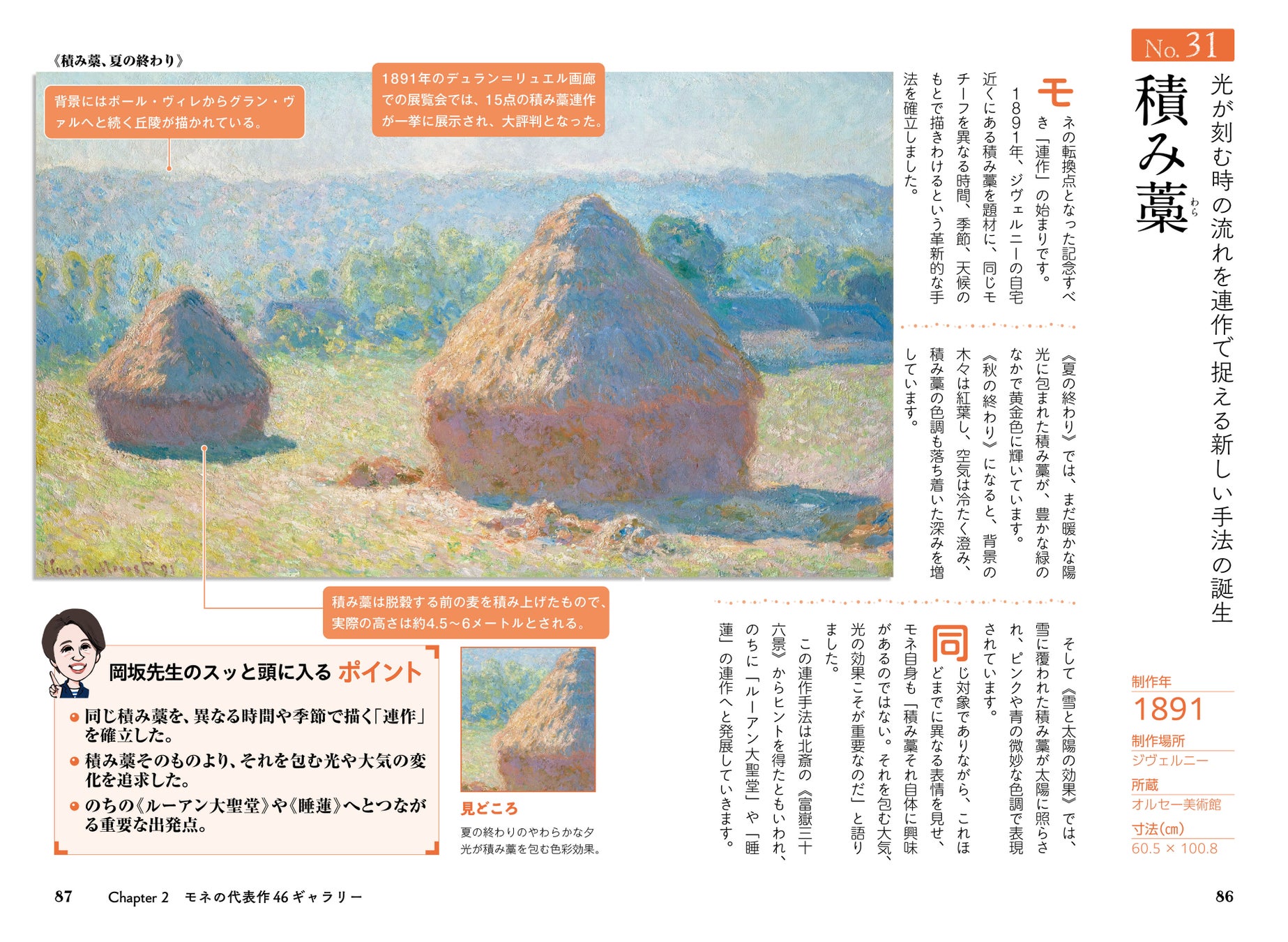 本書は、モネの波乱に満ちた生涯と人間的な魅力に迫りながら、代表作46点をわかりやすく解説。「印象派」という新たな絵画運動の中心人物として、従来の絵画の枠を超えたモネの芸術的な意図や表現の工夫に触れていきます。「印象、日の出」、「散歩、日傘をさす女」、「積み藁」、数々の「睡蓮」など、時代ごとに変化するモネの表現を、豊富な作品とともにじっくり味わえます。