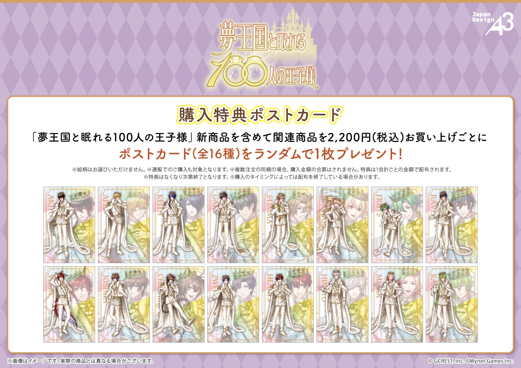 『夢王国と眠れる100人の王子様』新商品を含めて関連商品を1会計2,200円(税込)お買い上げごとに、購入特典としてポストカード(全16種)をランダムで1枚プレゼント。
