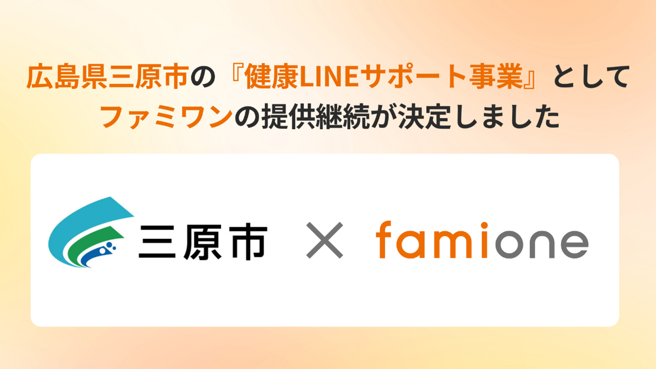 「子どもを願うすべての人によりそい 幸せな人生を歩める社会をつくる」をビジョンに掲げ、法人の従業員向け福利厚生や自治体の住民向け支援を行うヘルスケアサポートサービス「ファミワン」 https://famione.com/benefit/ などを展開する株式会社ファミワン(本社:東京都渋谷区、代表取締役:石川 勇介)は、広島県三原市(市長:岡田 吉弘、以下三原市)からの委託を受け、「健康LINEサポート事業」において、令和8年度のサービスの提供継続が決定いたしました。