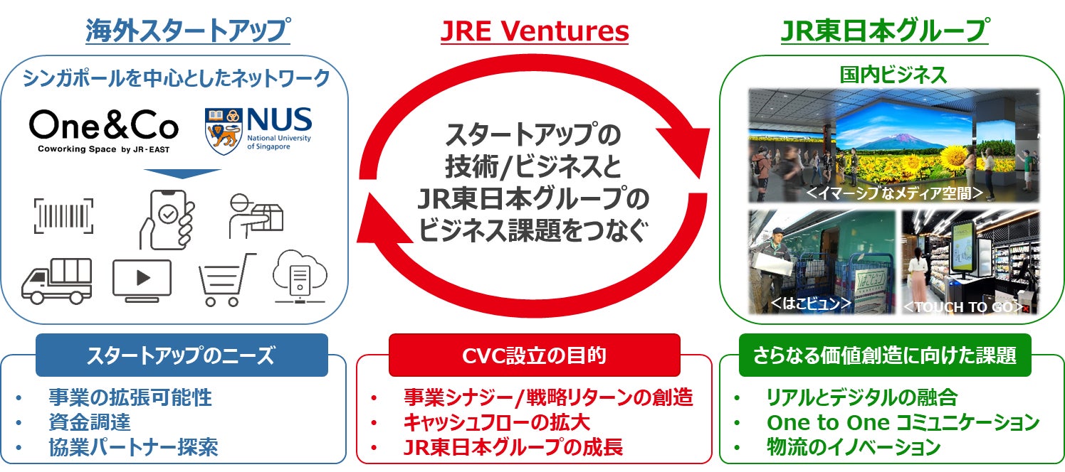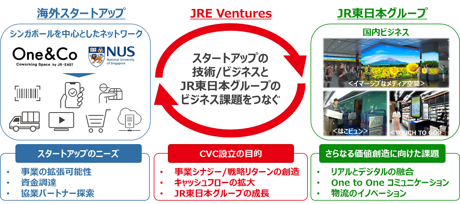 ○JR東日本は、スタートアップの成長とビジネス環境の整備が進む、主として東南アジア地域を中心に活動するスタートアップへの出資とJR東日本グループとの協業推進を行うコーポレートベンチャーキャピタル「JRE Ventures Pte. Ltd.」をシンガポールに設立します。 ○お客さまの暮らしをより豊かにしていく「生活ソリューション」の事業領域に関する革新的な技術やビジネスモデルを有するスタートアップを対象に、50億円の出資枠を設けます。 ○リテールテック領域などの海外スタートアップと共創することでJR東日本グループの事業シナジーを創造し、駅からお客さまや沿線のみなさまの暮らしとつながり心豊かな生活を実現する「Beyond Stations構想」を加速させ、駅の持つ可能性をさらに拡げて、リアルとデジタルが融合するJR東日本グループの新たな顧客体験価値を創造します。 |