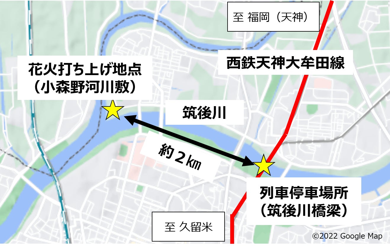 当コースでは、西鉄福岡(天神)駅から乗車後、花火の打ち上げ地点から約2 kmの距離にある西鉄天神大牟田線の筑後川橋梁上に約7分間停車いたします。また、花火が見えない区間では、富士フイルムイメージングシステムズ㈱提供の空間演出用プロジェクター(FP-Z8000)を使用して、筑後川花火大会のライブ映像を車内に映し出すことで、花火大会の会場にいるかのような演出をいたします。