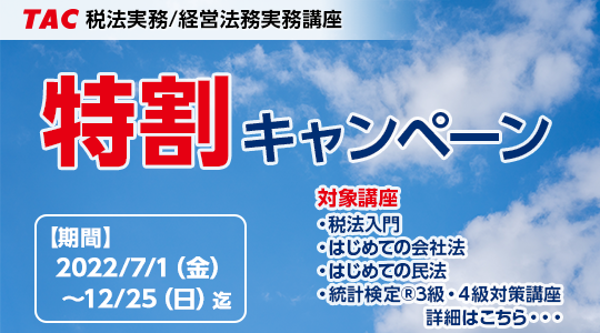 - 特割キャンペーン! 税法実務講座・経営法務講座で期間限定受講料OFF !