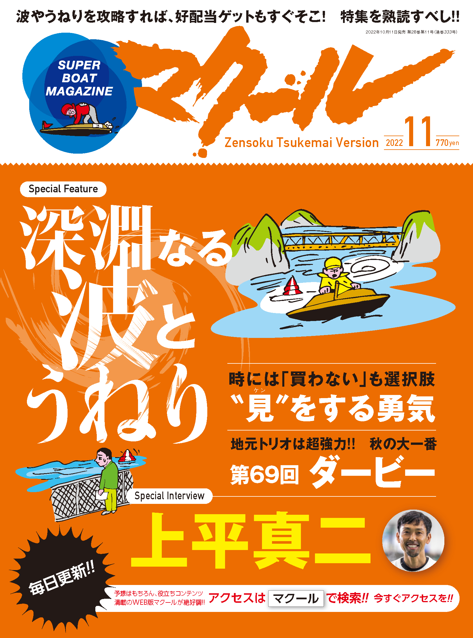 2022年10月11日からは『月刊マクール 2022年11月号』を発売いたします。巻頭インタビューはマスターズでGⅠ初優勝を飾った上平真二選手(広島)となっています。今回のテーマはボートレースの展開を左右する“波とうねり”。 全国24場の波事情やボートレース選手に訊く「波とうねり」対処法は必読です。