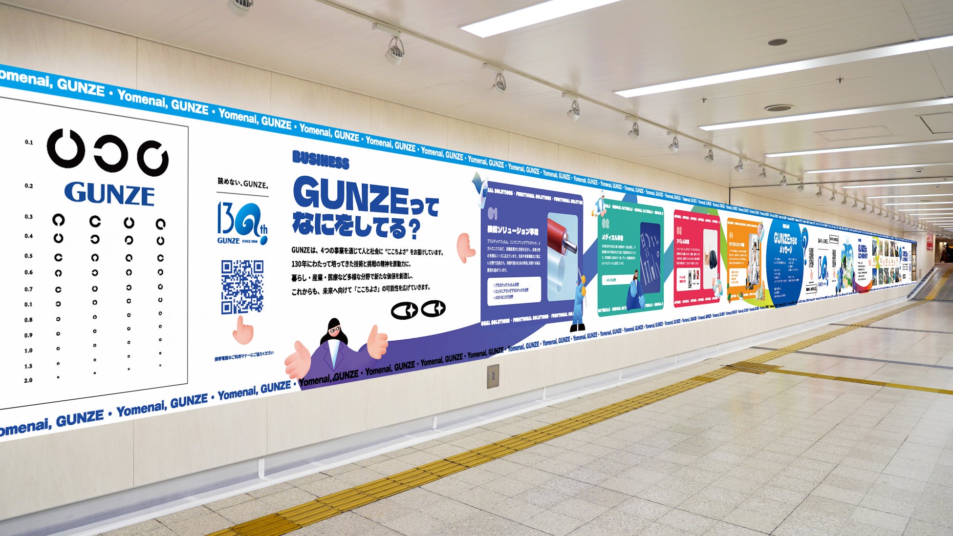 グンゼは今年130周年を迎え、より多くの方々に当社を知っていただけるよう、さまざまな企画に取り組んでいます。その一つとして、新生活を始める方も多い4月、通勤や通学などで桜橋アベニューを通られる方へ、グンゼを身近に感じてもらえる媒体として、通路の端から端まで使った42メートルの広告を掲出しました。JR大阪駅側からは現在のグンゼの事業を紹介し、西梅田駅側からは1896年創業からの歴史をたどり、これから向かう未来を描いています。