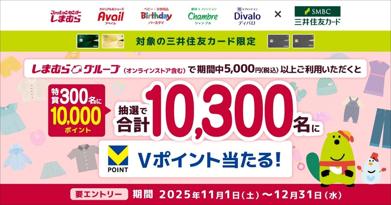 三井住友カード株式会社(本社:東京都江東区 代表取締役 社長執行役員 CEO:大西 幸彦 以下:三井住友カード)は、2025年11月1日(土)より、株式会社しまむら(本社:埼玉県さいたま市大宮区 社長執行役員 高橋 維一郎 以下:しまむら)が運営する全国のしまむらグループの店舗(ファッションセンターしまむら・アベイル・バースデイ・シャンブル・ディバロ・オンラインストア)にて、対象の三井住友カードを期間中合計5,000円(税込)以上ご利用で最大10,000円相当のVポイントが抽選で当たるキャンペーンを開催いたします。是非この機会に三井住友カードを使ってしまむらでのお買い物をお楽しみください。