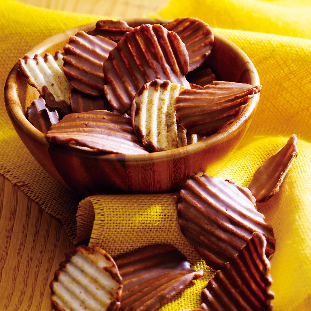 ポテトチップとチョコレート、意外な組み合わせから生まれた大ヒットのおいしさ。 パリッとした軽快な食感のポテトチップの片面に、口どけの良いチョコレートをコーティングしました。 チョコレートの甘さとポテトチップの塩味の絶妙なバランスがクセになるおいしさです。