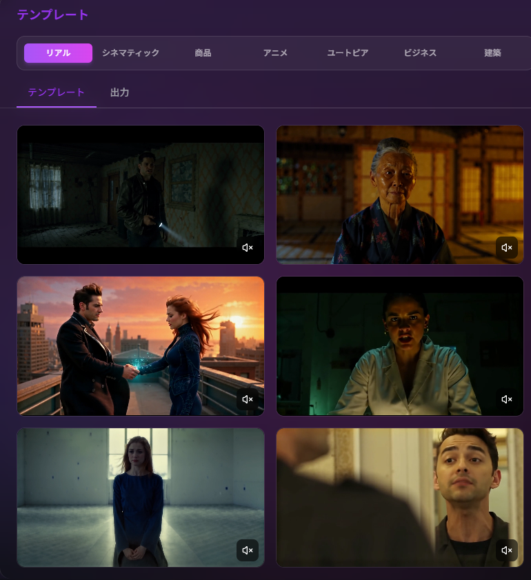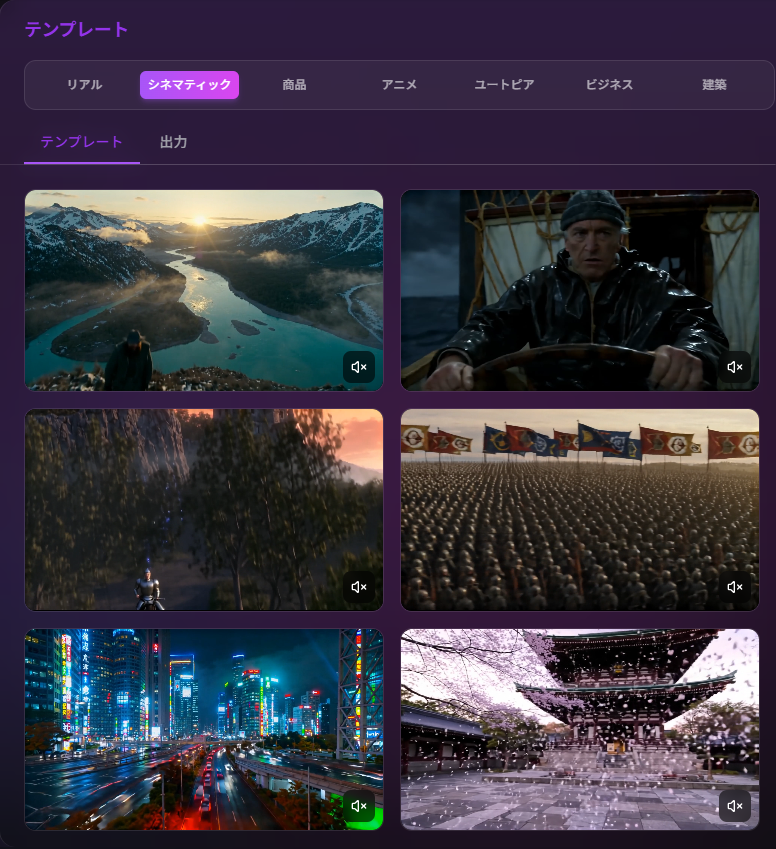 プロンプトの書き方に悩んでいる方や、さまざまなスタイルの動画を試してみたい方に向けて、映像スタイル別のテンプレートを用意しています。