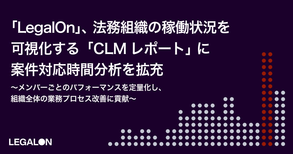 株式会社LegalOn Technologies(本社:東京都渋谷区、代表:代表取締役 執行役員・グループ CEO 角田 望、以下:LegalOn Technologies)が提供する、法務特化型AIエージェント搭載のProfessional AI for Legal「LegalOn」(https://www.legalontech.com/jp/)は、法務組織の稼働状況を可視化する「CLMレポート」を強化しました。案件対応時間やメンバーごとのパフォーマンスを定量化することで、データに基づいた客観的な組織マネジメントを支援します。