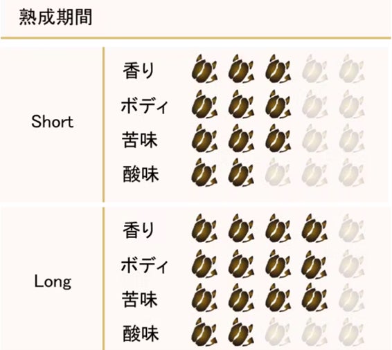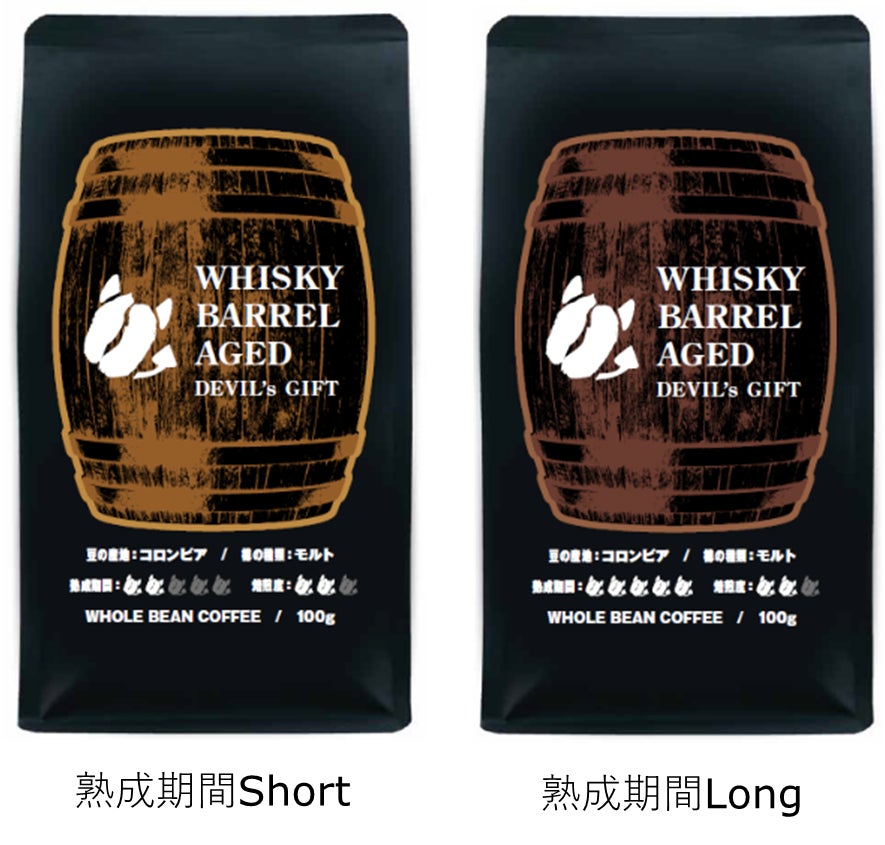 熟成期間によって風味が大きく異なることを楽しむため、熟成期間が異なる2種類を販売します。短期熟成品は、ふんわりとウイスキーの香りが漂うコーヒーをお試しいただきたい方や、普段ウイスキーを飲まない方にお勧めです。長期熟成品は、しっかりとしたウイスキーの香りがするコーヒーをお試しいただきたい方や、普段ウイスキーを愛飲されている方にお勧めです。両商品ともにアルコール分は含んでいません。