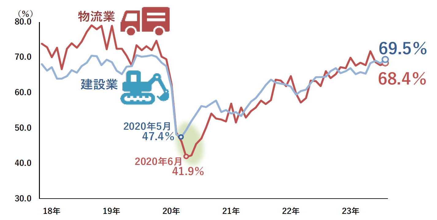 本格的なアフターコロナとなった2023年は、人手不足割合の高止まりが続いている。既に不足感は新型コロナ前の水準まで上昇しており、2024年問題に直面する建設業や物流業、アフターコロナで需要が回復している旅館・ホテルや飲食店では、特に人手不足感が際立っている。