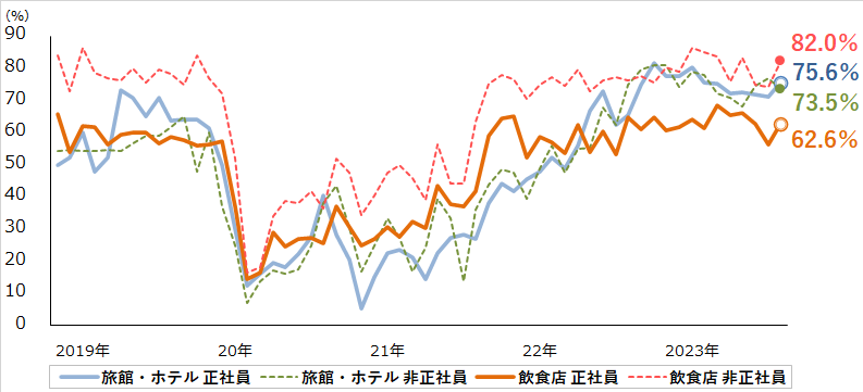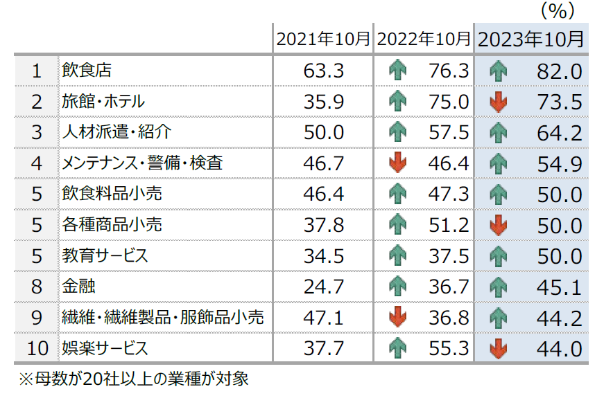 非正社員では30.9%が人手不足を感じており、業種別では「飲食店」が82.0%で最も高かった。また、正社員ではトップだった「旅館・ホテル」(73.5%)は、非正社員では2番目の高水準となった