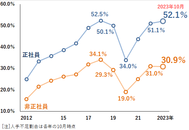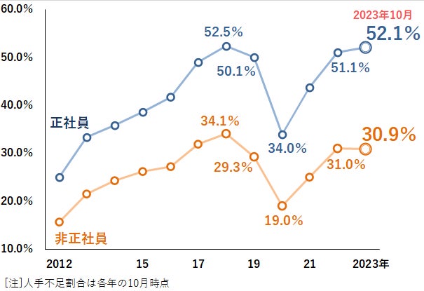 2023年10月時点における全業種の従業員の過不足状況について、正社員が「不足」と感じている企業は52.1%だった。前年同月比で1.0ポイント上昇しており、10月としてはこれまで最も高かった2018年(52.5%)に次ぐ高水準を記録した。また、非正社員では30.9%となり、10月としては前年に続いて3割を上回った。