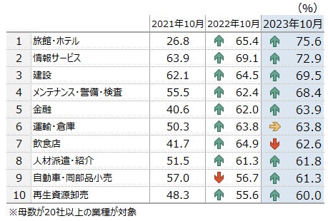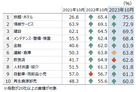 正社員の人手不足割合を業種別にみると、「旅館・ホテル」が75.6%で最も高かった。当業種の企業からは、「円安の影響で訪日客数が回復している」(東京都)や「新型コロナが5類になり、人の動きが活発でリベンジ消費がみられる」(島根県)、「秋の紅葉シーズンに入り、集客が多い」(岩手県)などの声があり、インバウンドなど観光需要が活況だったことによって人手不足も顕著に表れたとみられる。