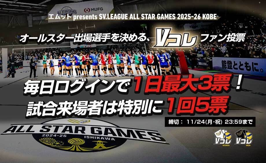 公益社団法人SVリーグのゴールドパートナーとしてSV.LEAGUE公式カードコレクション「VOLLEYBALL CARD COLLECTION」や公式アプリ「スマートV」の開発・運営などリーグの活動を支援する株式会社VOLZ(ヴォルツ、旧社名:株式会社Tixplus、本社:東京都渋谷区、代表取締役:池田宗多朗、以下VOLZ)は、公式カードコレクションサービス「VOLLEYBALL CARD COLLECTION(Vコレ-WOMEN-)」において、2026年1月31日(土)に開催する「エムット presents SV.LEAGUE ALL STAR GAMES 2025-26 KOBE」のファン投票の受付を開始いたしましたことをお知らせいたします。