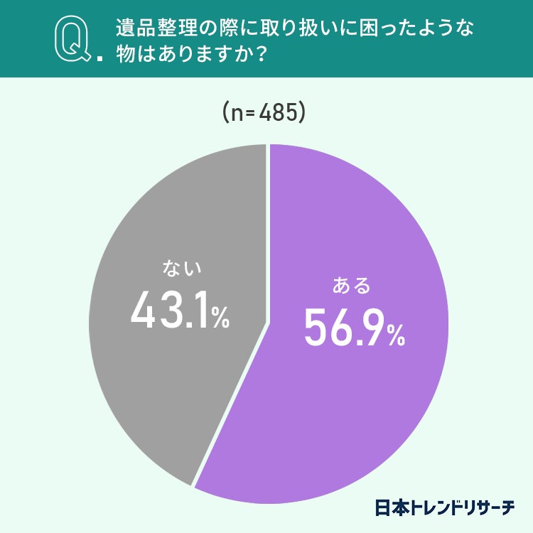 まずは、事前調査で「遺品整理をしたことがある」と回答した全国の男女485名の方に、「遺品整理」の際に取り扱いに困ったような物かあるかについて聞いてみました。