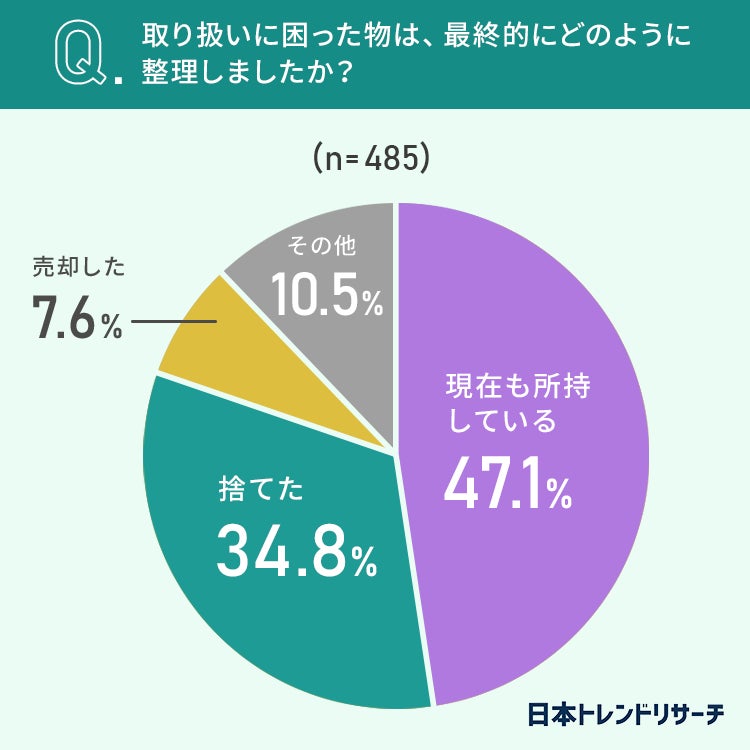 「遺品整理をしたことがある」と回答した全国の男女485人のうち、47.1%が取り扱いに困った物を「現在も所持している」と答えました。