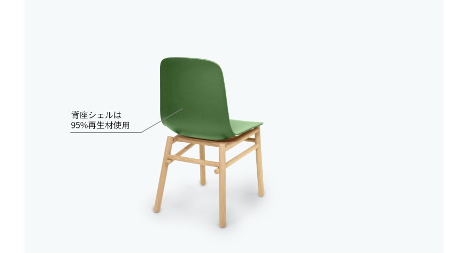 背シェルには再生材を95%使用、脚部は同社が独自に仕入れた木材を使用しています。チェアーの製造・輸送過程ではCO₂が排出されてしまいますが、1脚の販売につき1本の植林を行うことで、植林された樹木が排出量以上のCO₂を吸収することを見込んでいます。商品の製造・販売過程を通して、生物多様性の保全に貢献します。