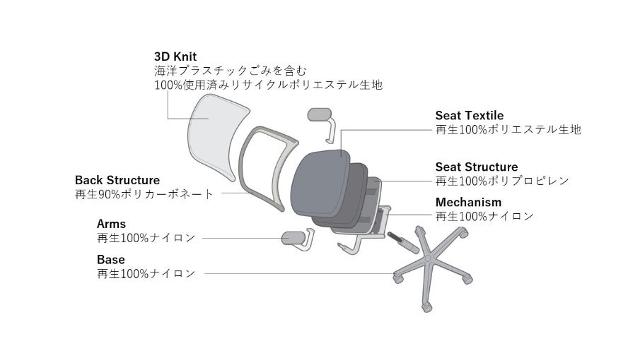 樹脂・スチール・アルミの3種の素材について55.9%という高い再生材の使用率となっています。廃棄時には素材の94%を簡単に分解することでき、リサイクルが可能です。背もたれには、海に漂うゴミ(海洋プラスティック)を回収して作られたオリジナルメッシュを採用しています。