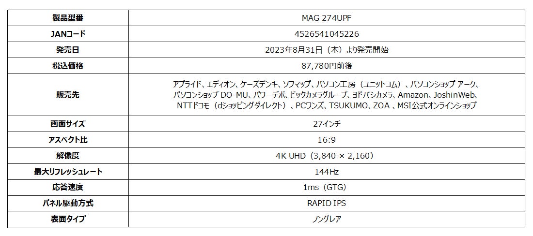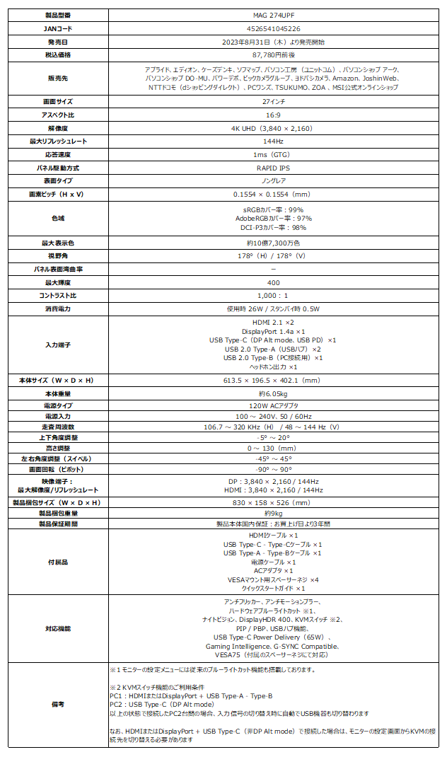 ■ MAG 274UPF製品ページ: https://jp.msi.com/Monitor/MAG-274UPF
