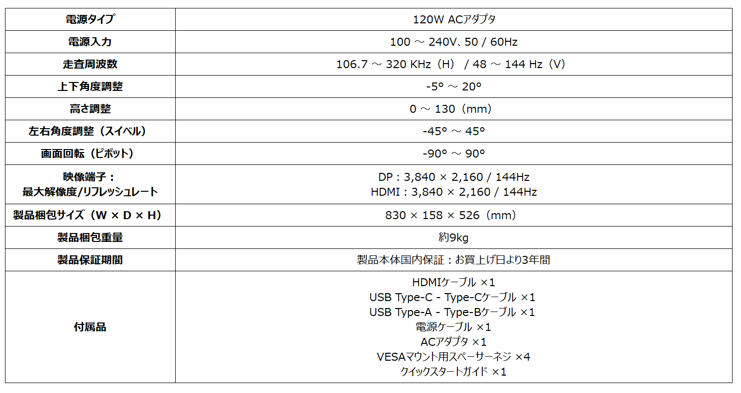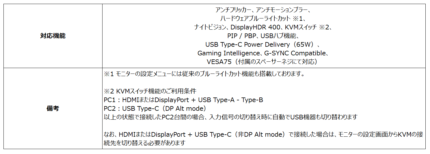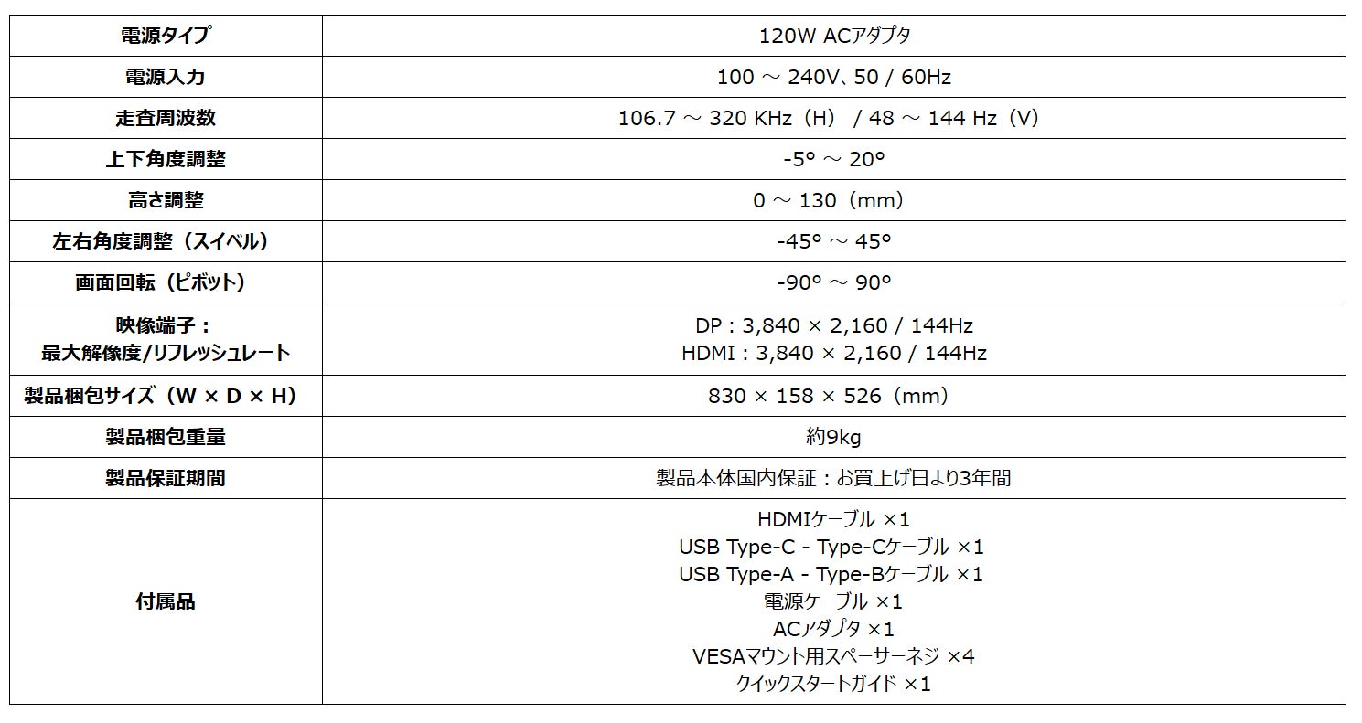 「MAG 274UPF」はフルHDの約4倍の情報量で高精細な表示が可能な4K UHD(3,840 × 2,160)解像度、高画質と高速応答を実現したRAPID IPSパネル、リフレッシュレート144Hz、応答速度1ms(GTG)の高いスペックを誇り、残像感の少ない映像で快適にゲームプレイを楽しむことができます。さらに、リアルな映像を表現可能なDisplayHDR 400、同期機能としてG-SYNC Compatible、暗いシーンでも視認性を上げるナイトビジョン、2台のPCでUSB機器を共有可能なKVMスイッチ、対応したノートPCやスマートフォン等を急速充電可能なUSB PD65W機能を搭載しており、高精細かつ高画質な映像でよりゲームを楽しみたい方にお勧めなゲーミングモニターです。また、エルゴノミクスデザインを採用したスタンド機能で無理のないポジションで使用することができ、長時間の使用において目の疲労を軽減するアンチフリッカー、色味の変化を抑えつつ目の負担を軽減するハードウェアブルーライトカット機能を搭載し、Adobe RGBカバー率:97%、DCI-P3カバー率:98%の広色域対応でクリエイターにもお勧めです。入力端子はHDMI 2.1 ×2、DisplayPort 1.4a ×1、USB Type-C(DP Alt mode、USB PD)×1に対応しており、PCとゲーム機など複数の機器を接続する事が可能で、背面のジョイスティックを操作することで簡単に入力切り替えやメニュー操作を行うことができ、PCとモニターを付属のUSBケーブルで接続し、専用ソフトを導入する事によりPCで上から各種設定変更が可能なGaming Intelligence機能にも対応しております。VESA規格にも対応しており、付属のスペーサーネジを使用する事でモニターアームに取り付ける事が可能です。