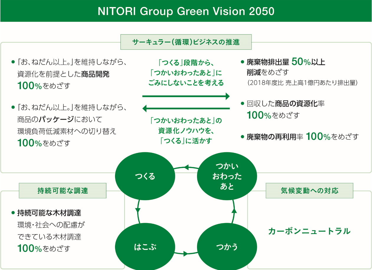 今年は、加速するグローバルへの出店戦略や現地ナショナルスタッフの活躍の様子に加え、全領域に関わるIT・DXの活用方針を3名の取締役による座談会を含めて拡充して記載しております。また、新たに策定したニトリグループの環境目標「NITORI Group Green Vision 2050」のほか、グループの人的資本、お取引先様である海外サプライヤーインタビュー等も掲載しています。