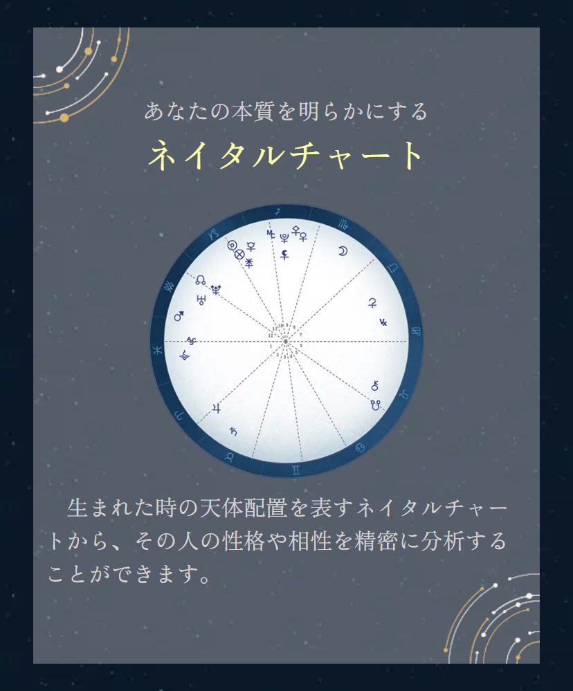 数千年の歴史を持つホロスコープは、長い期間かけて蓄積された膨大な統計と分析に裏付けされたもの。そんなホロスコープをマニア・プロ仕様に詳細読み解いていき、星から授かった「あなた」だけの運命を丁寧に分かりやすくお伝えします。