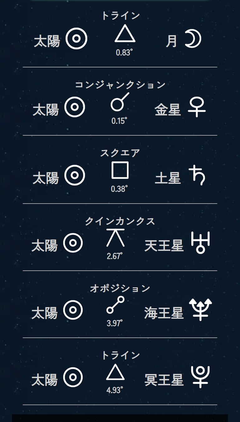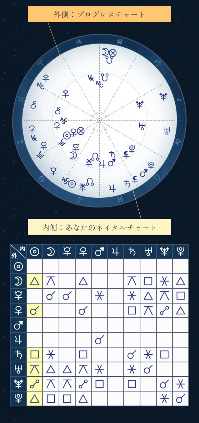 その人の生まれた時の天体配置を表す「ネイタルチャート」とその天体を年齢ごとに進行させた「プログレスチャート」。この2つのチャートによって示される惑星の配置が特定の角度(アスペクト)になったとき、その惑星同士は強力に作用しあうようになります。そしてその作用は行動パターンとなって現れるため、つまりアスペクトを見ることで、今後の運勢や将来のことを「これから先どんなアクションを起こすのか」といった具体的なレベルで知ることができるのです。