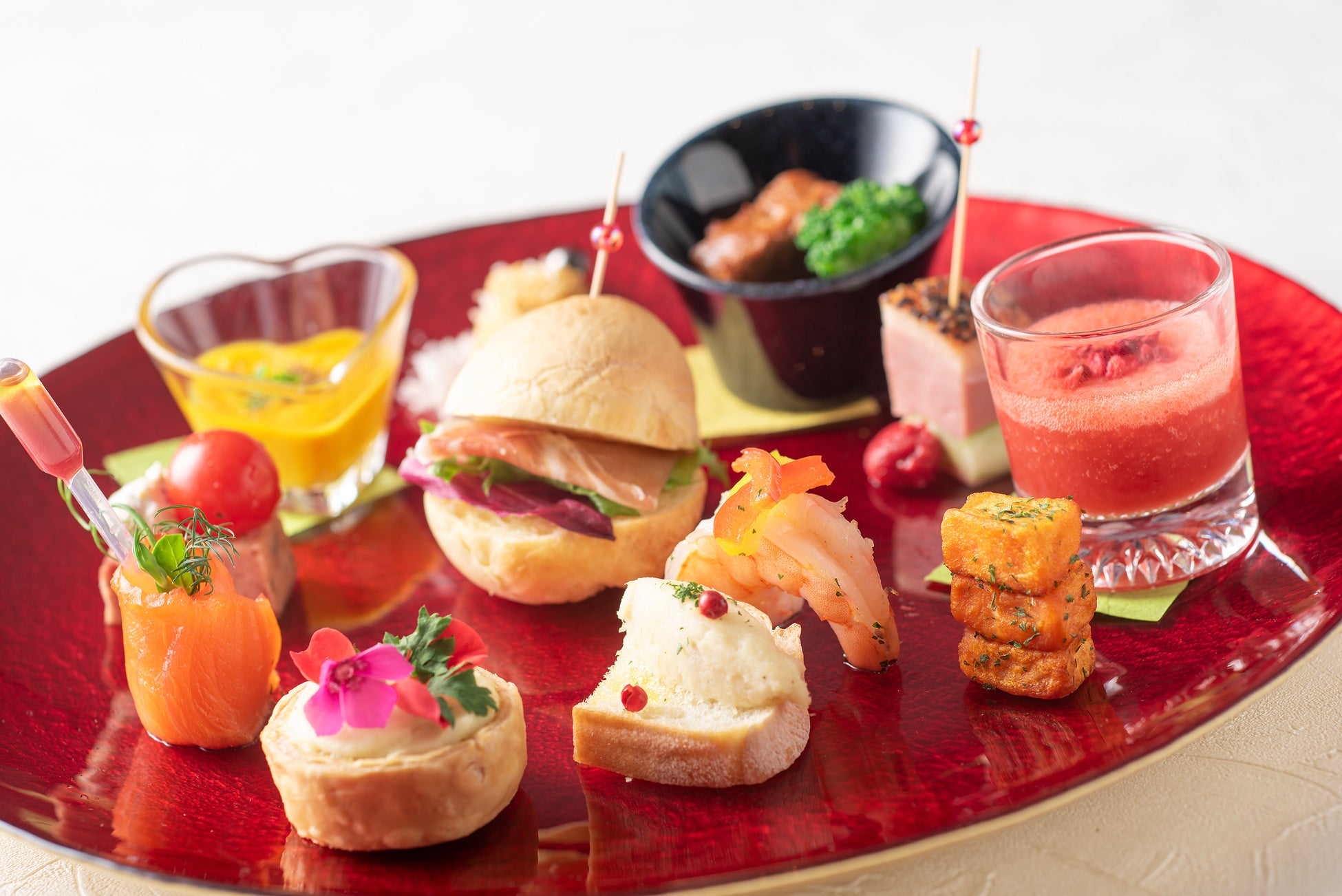 「苺3種の食べ比べ」や「スモークトラウトサーモンのストロベリードレッシング」など、創意工夫あふれるセイボリーを取り揃えています。真っ赤なプレートには、オーブンで焼き上げたサクサク生地に生花を添えた「キノコとベーコンのキッシュ」や「海老とパプリカのセビーチェ」、野菜とハモンセラーノをもちもち食感のポンデケージョでサンドした食べ応えのある「ポンデケージョとハモンセラーノのサンド」など、目にも楽しい一品が並びます。