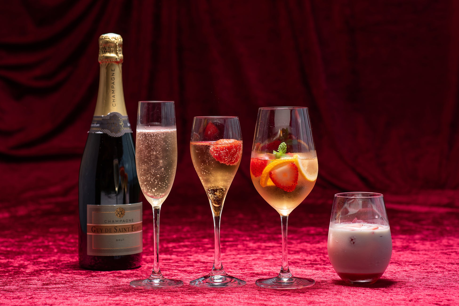 苺を中心とした15種類のスイーツが勢ぞろい。サクサクのタルトにジューシーな苺をのせた「苺のタルト」、しっとりとしたスポンジ生地に可愛らしいお花をトッピングした「苺のショートケーキ」、ふんわりとした「苺のバウムクーヘン」、フランス産発酵バターを使用した「苺のカヌレ」、ハート型の器に入った可愛らしい「苺のソースとココナッツのブランマンジェ」など、多彩な味わいをお楽しみいただけます。また、フレーバーブラスターで香り豊かなバブルを添えた「苺と薔薇香るパフェ」は、見た目にも味わいにも特別感を演出します。