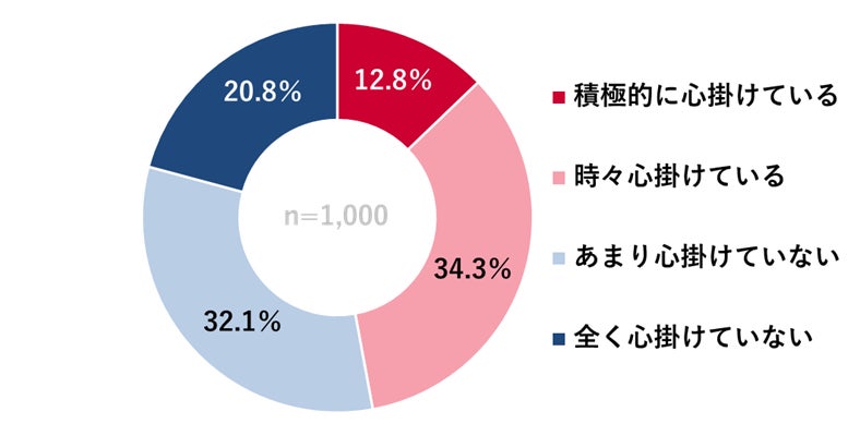 防犯のために、日頃から近所の方とコミュニケーションを取るように心掛けているか聴取した。「積極的に心掛けている」(12.8%)、「時々心掛けている」(34.3%)を合わせると47.1%となり、およそ半数近くを占めた。