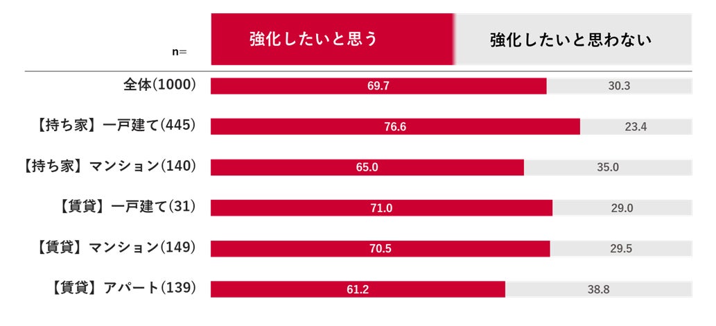 また、住まいの防犯対策については、全体で7割近くが「強化したいと思う」と回答した。特に、一戸建てでは、持ち家・賃貸問わず7割を超えて高いことが分かった。
