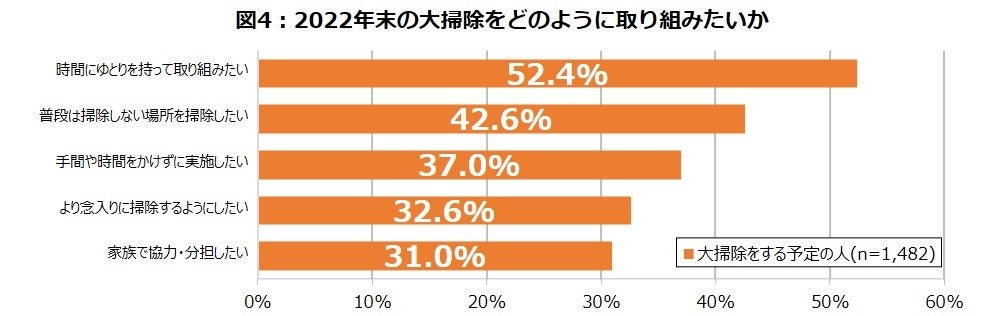 ・大掃除の取り組み方は、過半数が「時間にゆとりを持って取り組みたい」と回答。効率よく大掃除を実施できるよう事前準備をしよう!