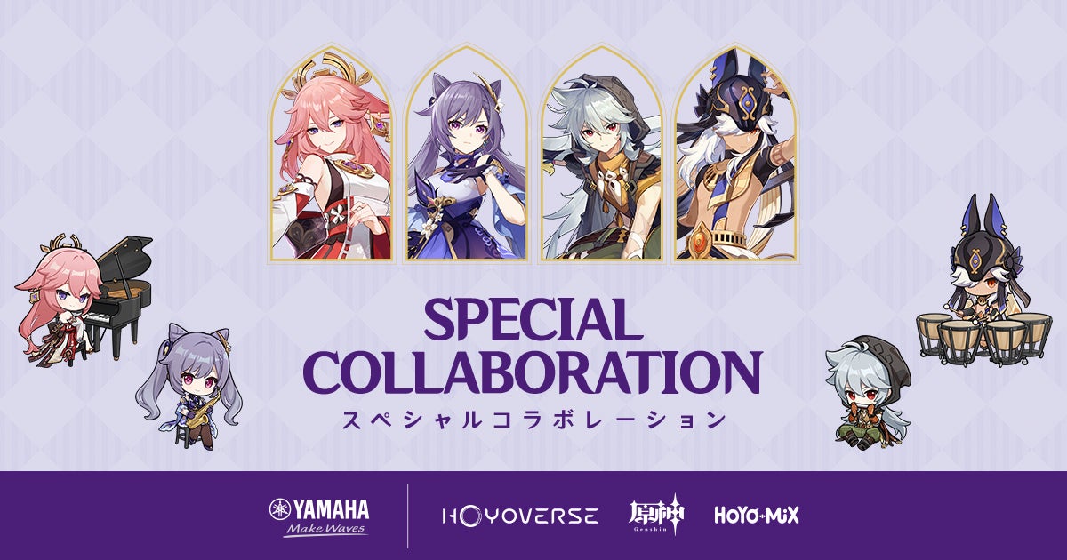 またヤマハ銀座店では、「原神」が“店舗ジャック”を展開します。描き下ろしコラボビジュアルを使用したスペシャルグッズが貰えるキャンペーンやキャラクター等身大パネルの展示など、ゲームの世界を想起させるイベントを開催します。なお、「原神」とのスペシャルコラボイベントは、ヤマハミュージック 名古屋店とヤマハミュージック 大阪なんば店でも今後開催予定です。