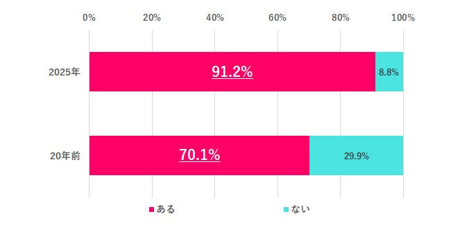 職場で性別による格差を感じたことはあるか聞いたところ、2025年は「ある」91.2%、「ない」8.8%でした。20年前は「ある」70.1%、「ない」29.9%だったので、「ある」と回答した人が20%近く増えています。