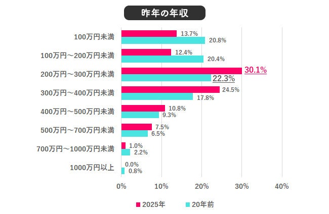 昨年の年収について聞いたところ、2025年は1位「200~300万円未満」30.1%、2位「300~400万円未満」24.5%でした。20年前は1位「200~300万円未満」22.3%、2位「100万円未満」20.8%です。