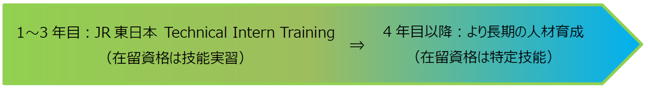 「JR東日本Technical Intern Training」を特定技能に先行する初期トレーニングと位置づけ、5S活動や安全教育、基礎技術教育を含めた日本的な仕事の仕方や日本の鉄道技術を実習生にしっかりと伝え、さらに充実した内容にします。本施策を修了した方のうち、本人意向と会社意向が合致した場合に特定技能の在留資格に移行して就労を継続することを可能とするべく、実習生の長期のキャリアプランに伴走していきます。