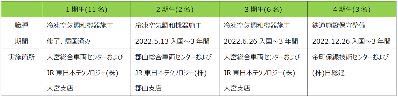 これまで冷凍空気調和機器施工職種あるいは鉄道施設保守整備職種にて、ベトナムから累計22名の実習生を受け入れています。修了済みの実習生11名は2021年度に実習を修了し、ベトナムに帰国後は鉄道他各企業で活躍しています。現在実習中の実習生11名は2025年度に修了予定です。
