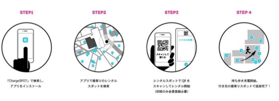 モバイルバッテリーシェアリングサービス「ChargeSPOT」は、外出時にスマートフォン等の充電が不足した際に、専用アプリから近くのバッテリースタンドを探して手軽にバッテリーを借りられ、別のバッテリースタンドに返却ができるサービスです。