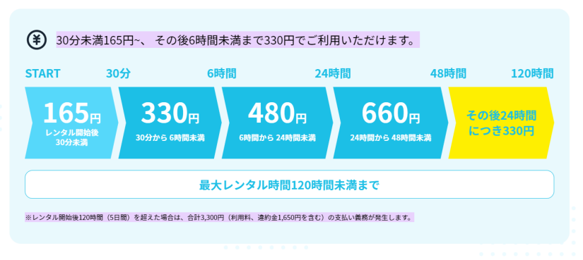 30分未満は165円、6時間未満は330円、24時間未満は480円、48時間未満は660円でレンタルできます。その後最大5日間(120時間)まで1日(24時間)330円で利用できます。