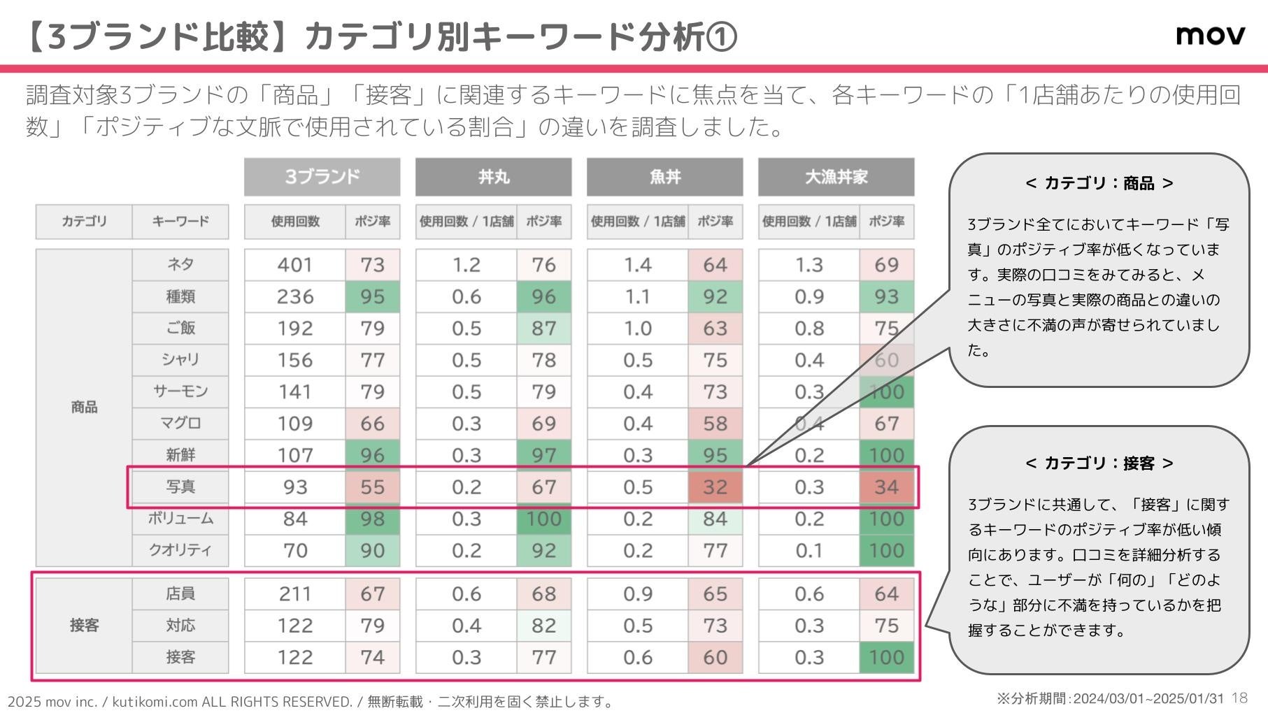 こちらの表では、調査対象3ブランドの「商品」「接客」に関連するキーワードに焦点を当て、各キーワードの「1店舗あたりの使用回数」「ポジティブな文脈で使用されている割合」の違いを調査しています。