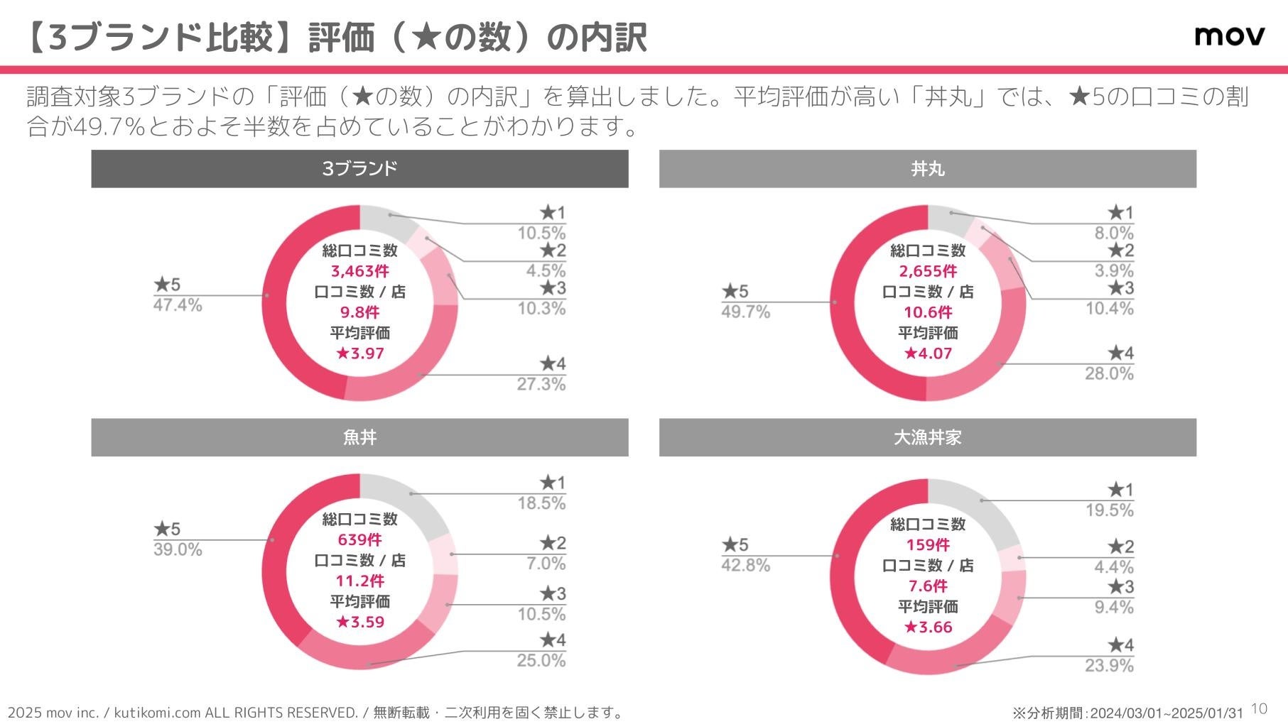 こちらのグラフでは、調査対象3ブランドの「評価(★の数)の内訳」を算出しています。平均評価が高い「丼丸」では、★5の口コミの割合が49.7%とおよそ半数を占めていることがわかります。