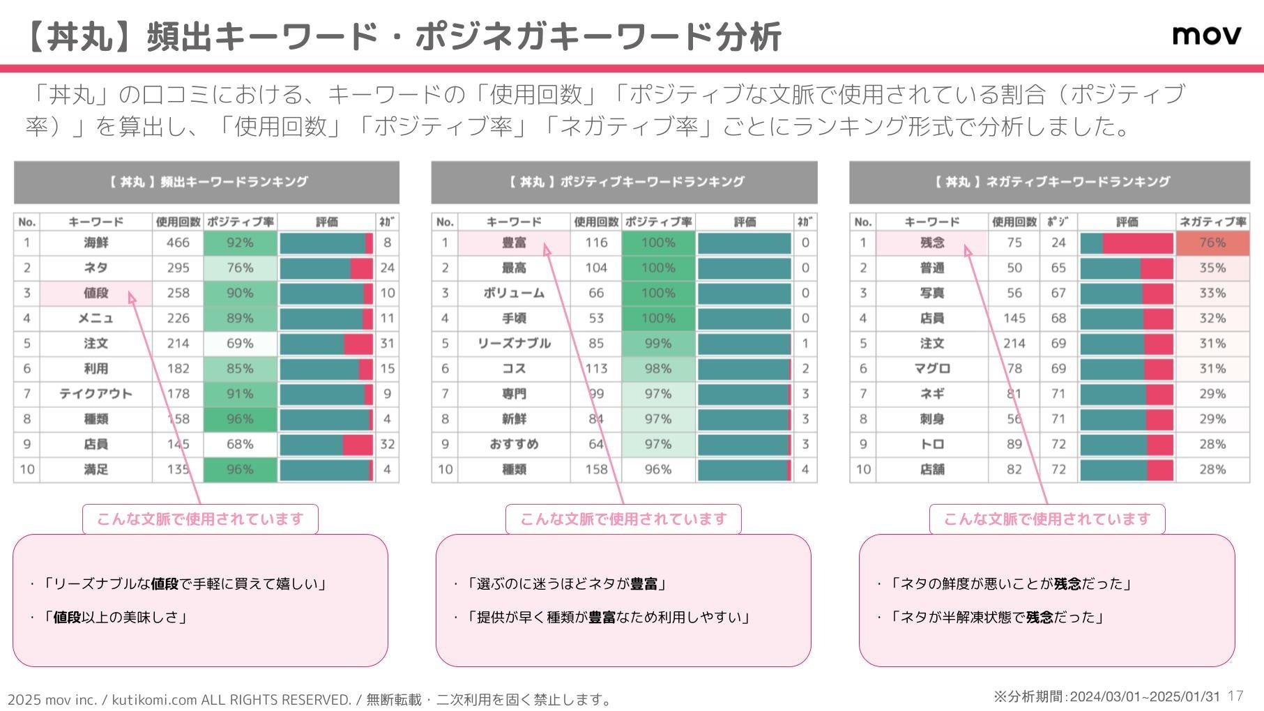 こちらの表では、「丼丸」の口コミにおける、キーワードの「使用回数」「ポジティブな文脈で使用されている割合(ポジティブ率)」を算出し、「使用回数」「ポジティブ率」「ネガティブ率」ごとにランキング形式で分析しています。