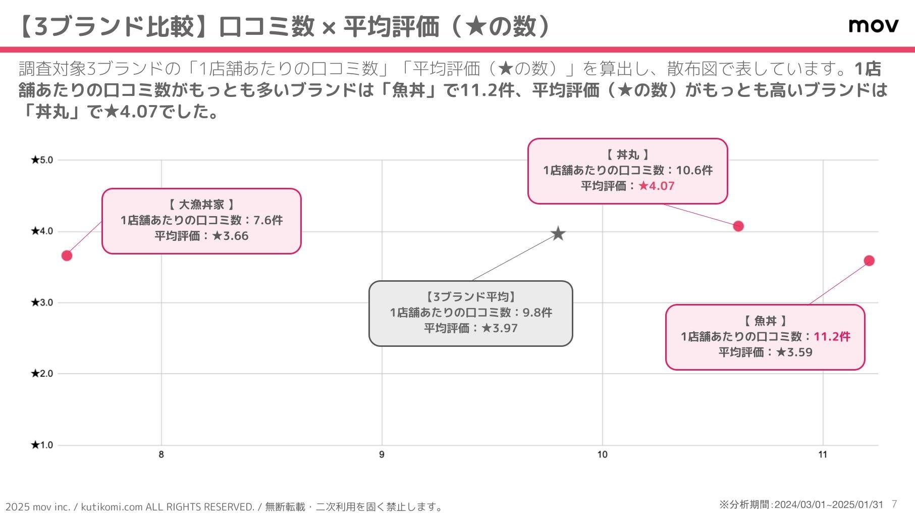 こちらの散布図では、調査対象3ブランドの「1店舗あたりの口コミ数」「平均評価(★の数)」を算出しています。1店舗あたりの口コミ数がもっとも多いブランドは「魚丼」で11.2件、平均評価(★の数)がもっとも高いブランドは「丼丸」で★4.07でした。