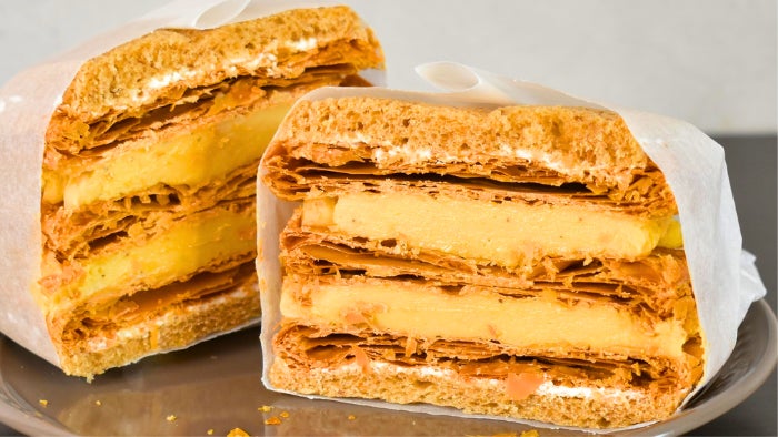 濃厚なカスタードとサクサクのミルフィーユパイを丸ごとサンドイッチにした新感覚サンドイッチ。サクサクなパイはふわっとした食パンと相性抜群。